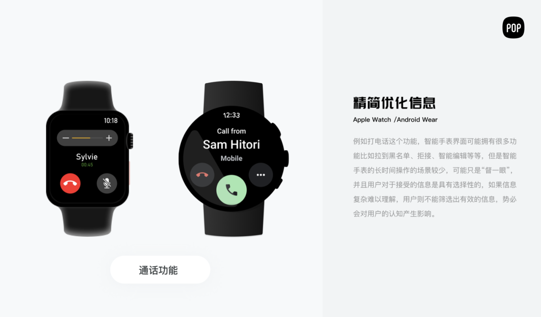 但是智能手表的长时间操作的场景较少,可能只是“瞥一眼”,并且用户对于接受的信息是具有选择性的,如果信息复杂难以理解,用户则不能筛选出有效的信息,势必会对用户的认知产生影响。