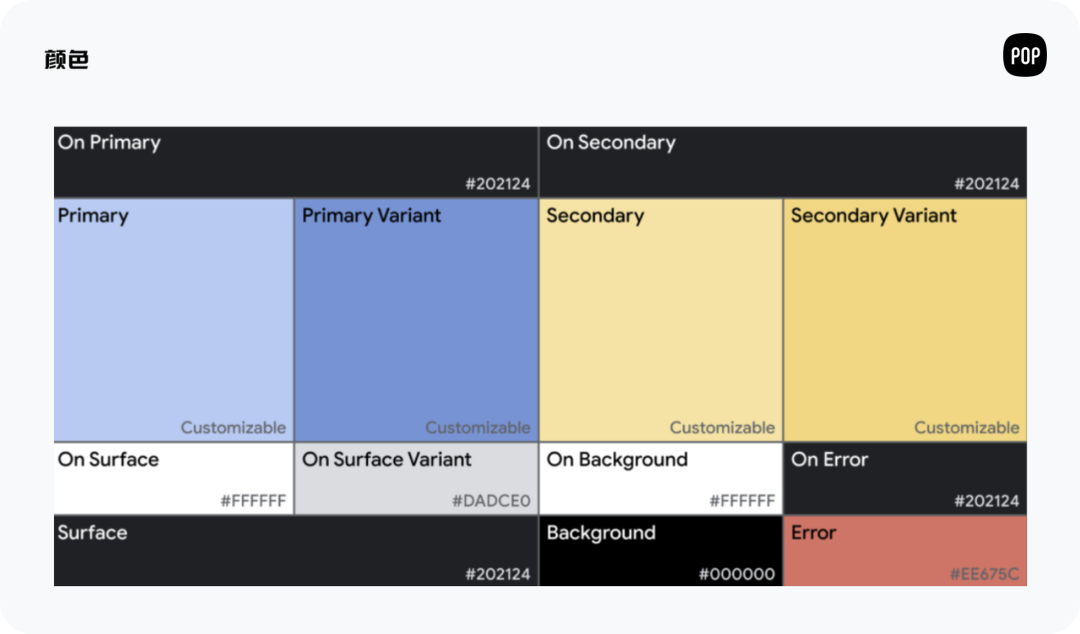 Wear OS 配色方案是基于基线 Material Design 颜色主题创建的。