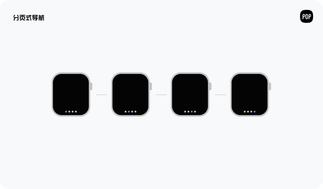 分页式主要就是将功能模块化,均衡罗列在手表上,优点是信息获取比较完整,但是缺点是不可适用于拓展性的系统(拓展性系统是指第三方软件平台的系统),因为过多的模块会导致界面冗余,信息繁杂且无序。