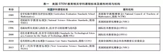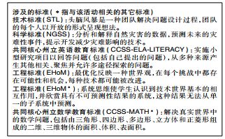 20世纪80年代以来,美国兴起了声势浩大的基于课程标准的教育改革运动,试图通过课程标准提升教育质量。课程标准明确说明学科的主要概念与原则、核心知识内容、主要过程与基本技能,提供共同的学习目标、学习内容和评价依据。因此,在STEM整合教育中,标准也受到了极大关注。相关学科部分课程标准见表一。2010年,《共同核心州立标准》(CCSS)正式颁布,它和《共同核心州立英语艺术与历史/社会、科学、技术学科中的读写标准》都要求与STEM学科建立更多更深的联系。2013年,《下一代科学教育标准》(NGSS)明确包含工程和科学的核心理念及实践知识,并希望科学教师以整合的方式教授科学和工程知识。