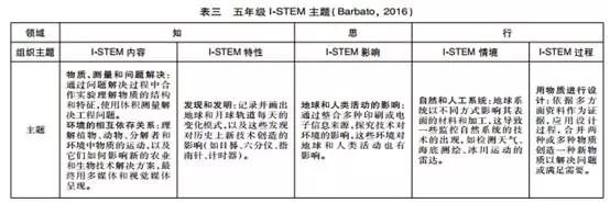 知、思、行的领域划分,与传统关注知识和行为的课程设计相比,增加了思维的维度,凸显了思维的地位。在组织主题方面,“I-STEM内容”从独立学科角度呈现,“I-STEM特性”从整合的角度呈现;“I-STEM影响”关注科学、技术、工程与自然、社会的相互关系;“I-STEM情境”反映了STEM相关学科尤其是技术与工程面向真实世界,具有应用性、实践性的特点;“I-STEM过程”从实践角度反映各学科本质。