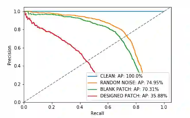 注意到与之对比的同样大小的随机噪声patch和空白的patch仅使得检测器性能分别降低了25.05%和29.69%。
