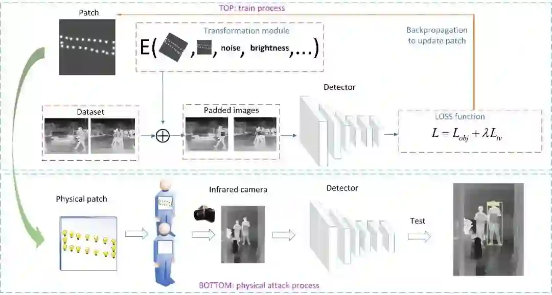 本文首次提出了针对红外行人检测系统进行物理攻击的方法。作者在数字世界中基于二维高斯函数构建对抗性的patch,并在物理世界中用小灯泡实现了对抗性的板子。