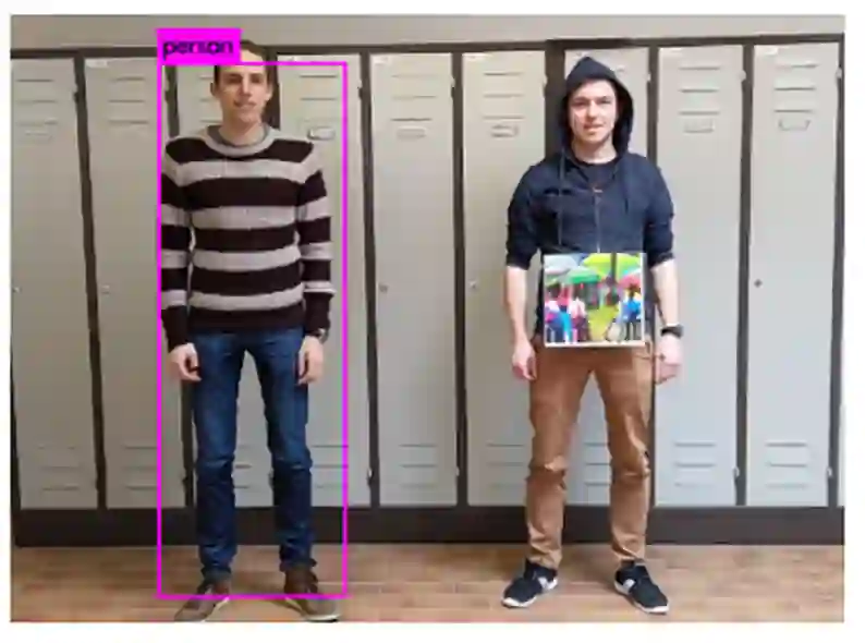 以下给出了一组具体的例子,由图中可以看到,在相同的条件下,使用了优化后的小灯泡板子的人没有被YOLOv3检测到,而持有空白板子以及什么都不带的人,被YOLOv3检测到了。