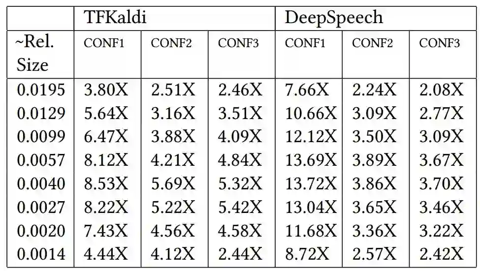 表 2. TFKaldi 和 DeepSpeech 上,DeepThin 模型在不同压缩大小和机器情况中的执行速度对比。不同机器之间的压缩大小略有不同,但是准确程度在 0.0001 以内。所有结果都以比未压缩的基线模型速度「X faster」的形式呈现。我们发现最大的提升来自缓存较小的平台,使用 DeepThin 可持续降低所有测试配置中的执行时间,使之更适合延迟和电量使用比较重要的环境。