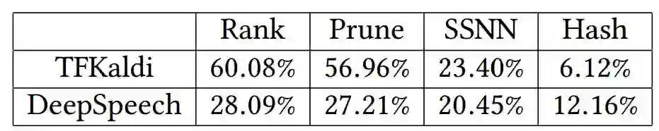 表 1. 与其他四种压缩方法相比,DeepThin 的平均提升。TFKaldi 数值是关于词错率下降,DeepSpeech 数值是关于测试误差减少。这里,我们看到不同的压缩方法在不同的数据集上各有偏重,而 DeepThin 在几乎所有测试情况中打败了其他压缩方法。