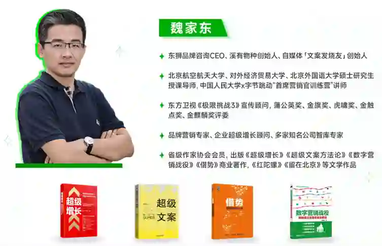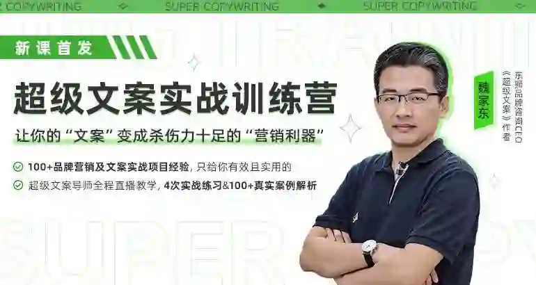 拒绝套路文案,作为长期深耕品牌营销领域,服务过100+知名品牌的老文案人,魏家东老师将带你全面系统拆解超级文案与初级文案的区别关键点。