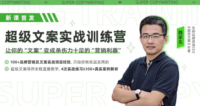 为此,我们找到了中国人民大学x字节跳动“首席营销官训练营”导师、资深品牌营销专家@魏家东老师,经过漫长的沟通、准备和内容打磨后,终于推出了这门从营销和品牌的底层出发,真正发挥文案“营销利器”价值的《超级文案实战训练营》。