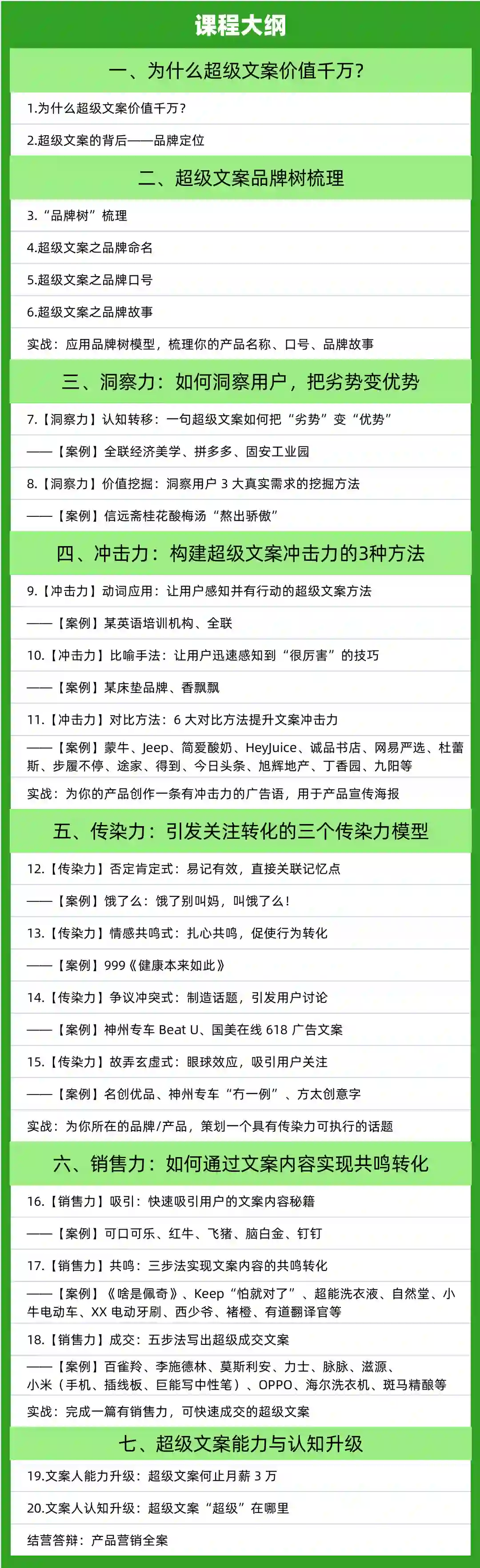 课程将以营销为主线,聚焦“传染力、洞察力、冲击力、销售力”4大最有效的武器,结合大量实战案例,帮助大家建立属于自己的文案认知模型,实现营收增长。