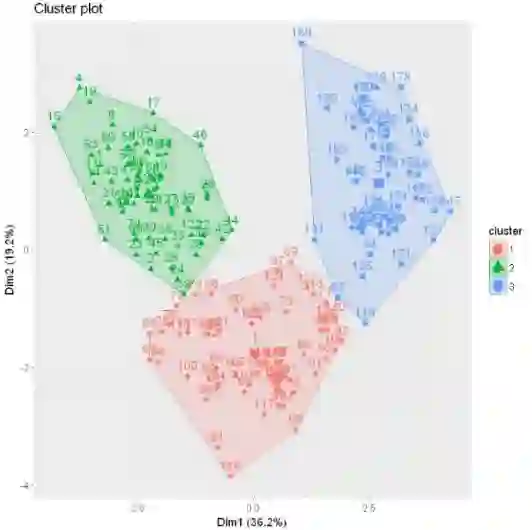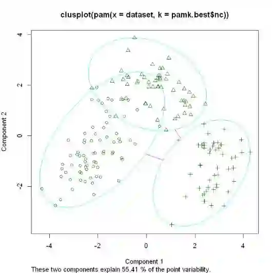pamk函数不需要提供聚类数目,也会直接自动计算出较佳聚类数,这里也得到为3