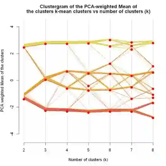 随着K的增加,从最开始的两类到最后的八类,图肯定是越到后面越密集。通过这个图判断较佳聚类数目的方法应该是看随着K每增加1,分出来的线越少说明在该k值下越稳定。比如k=7到k=8,假设k=7是很好的聚类数,那分成8类时应该可能只是某一类分成了两类,其他6类都每怎么变。反应到图中应该是有6簇平行线,有一簇分成了两股,而现在可以看到从7到8,线完全乱了,说明k=7时效果并不好。按照这个分析,k=3到k=4时,第一股和第三股几本没变,就第二股拆成了2类,所以k=3是较佳聚类数目