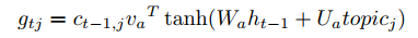 会对这个计算过程产生影响,对于一个剩余信息还很多的话题词应该相应增大它的attention系数,反之对于一个已经生成很多信息的话题词应该减小它的系数,attention系数的计算公式如下: