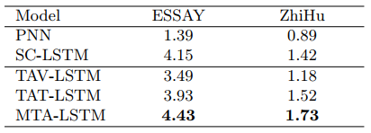表2 不同方法在ESSAY数据集上得到分值的平均值(最优值用粗体标出)