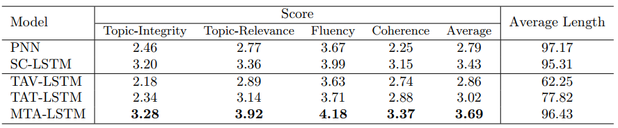 我们首先对提出的各个模型和一些baseline方法进行人工评价,评价指标为话题完整性(Topic-Integrity)、话题相关性(Topic-Relevance)、流畅度(Fluency)和连贯性(Coherence),每一项由三个人进行1-5的打分,之后进行平均,其评测结果如表2所示。在人工评价中,我们对三位打分人员的一致性进行了测试,kappa 值、t检验、Pearson系数都满足要求。