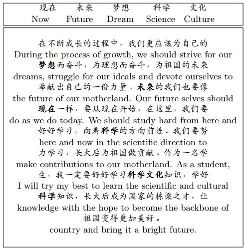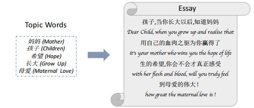 随着近几年来人工智能的飞速发展,我们想要去验证一下机器是否真的能够像人一样能说会道,其中作文自动生成可以看作是一个极具代表性的任务,不仅需要计算机去理解题意还要计算机针对所理解内容生成较长篇幅的作文,这其中逻辑通顺、语义连贯、主题明确、表达清晰都是所要研究的难点,针对这一问题,我们定义了段落级作文生成任务,其输入是多个话题词,输出是围绕这些话题词的一些文本,可以看作是段落级的作文。图1给出了具体示意,其输入的话题词是“妈妈”,“孩子”,“希望”,“长大”和“母爱”。