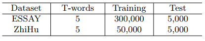 在本文中,我们的研究内容是作文自动生成,更具体的,是生成更多符合多主题的作文文本,为此我们建立一个作文语料库(ESSAY)。写作是中国高考语文卷中的一道大题,因此在互联网上有很多优秀作文样例供广大考生学习。所以,我们打算直接收集这些数据作为训练语料,同时为了保证爬取的文本质量,我们只对那些有评语和评分的作文进行爬取。具体过程如下,1)我们首先爬取了228,110 篇作文,并且这些都是老师评分比较高的;2)由于我们针对的是段落级文本生成任务,所以从这些作文中筛选出词数目在50-100的段落,组成我们的语料数据集;3)我们和诗歌生成一样,用textrank从这些段落中抽取出关键词作为话题词集。具体的语料集数量如表1所示。此外,由于作文语料库是由textrank抽取算法得到的话题词,其结果必然存在一些噪声。为了解决这一问题,我们又爬取了知乎语料库(ZhiHu),在这个数据集中,每个问题文本都有用户给出的1到5个话题词,和作文语料库类似,我们爬取那些词数目在50-100并且有五个话题词的段落,构建语料库,具体数量如表1所示。