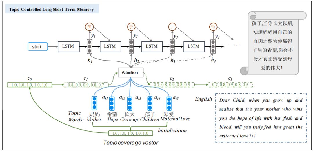 虽然上面的注意力模型已经很好地利用话题词的语义信息了,但我们发现这个模型并不能够保证生成的文本包含话题词集的所有语义信息,也就是说可能有话题词所带的语义并没有出现在最终生成的文本内容中。针对这一问题我们提出了多主题感知模型(Multi-Topic-Aware LSTM),具体的结构如图3所示。我们在传统的注意力公示上进行修改,引入coverage机制,如图3所示,我们引入了变量,我们期望用这个变量来表示每个话题词有多少信息已经被生成,同时还有多少信息没有被生成。首先,对于一个话题词,初始值为1,即