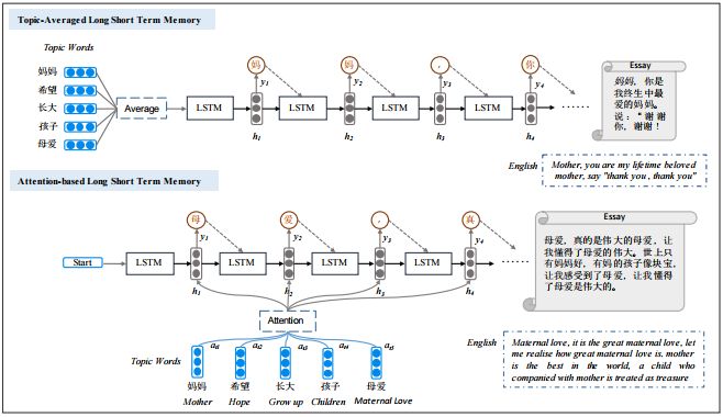 上述主题平均模型是直接将话题词的词向量进行平均,也就是说每一个话题词都被同等的对待,相当于我们认为话题词之间是没有重要性差别的。然而这种方法会带来一些歧义,使得话题词集合的语义表示并不是唯一的,例如某个话题词集合向量表示为[0.6, 0.8] ,那么它可以通过两个不同的话题词集合A:[0.5, 0.9] 和[0.7, 0.7] 、B:[0.3, 0.6] 和[0.9, 1.0] 来获得。针对这一问题我们引入了注意力机制(Attention Mechanism)。其作用主要有两方面,一是可以很好的实现对生成文本的控制;二是注意力机制可以刻画话题词和生成文本间的局部相关性,这是符合人类作写规律的。当人类完成一大段作文书写时,显然是某些句围绕一个话题词,而其他句围绕别的话题词,不可能每一句都是包含整个话题词集的语义,这样写出来的作文才具有一定层次感和逻辑关系,符合人们的写作规律。而注意力机制能很好的刻画这种局部相关性,因为在生成每个词时Attention结构会对话题词自动分配不同的权重,即相当于当前生成的这部分由权重比较高的几个话题词所决定。模型结构图如2下部分所示,具体计算细节可以参照原文。