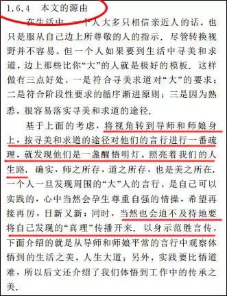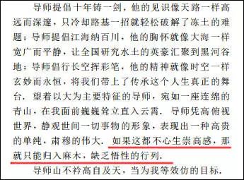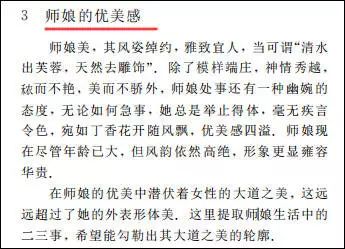 文章的第三部分则对师娘展开了赞美:由“女子无才便是德”、“给导师做饭是一种义务”、“见利思大义”三个小篇章组成。