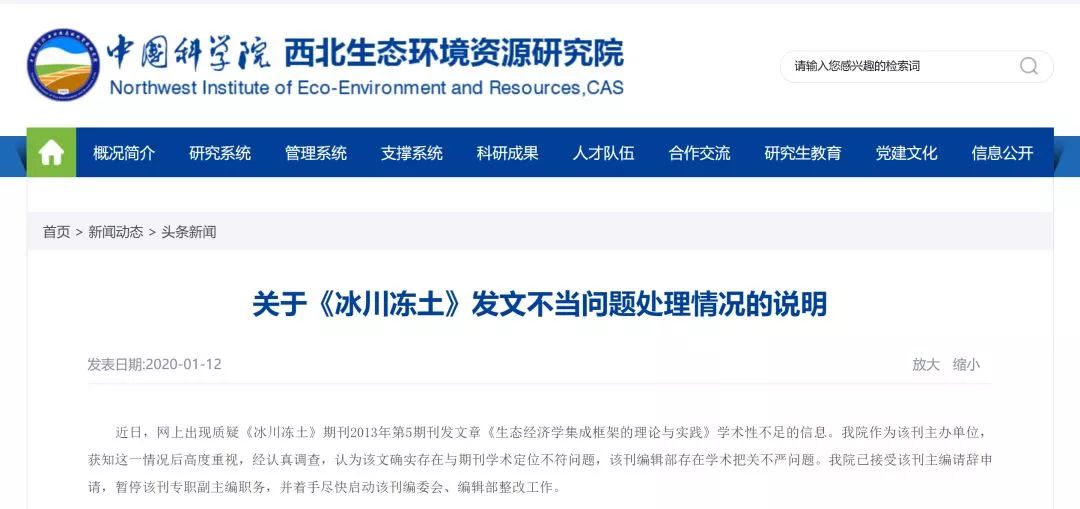 近日,网上出现质疑《冰川冻土》期刊2013年第5期刊发文章《生态经济学集成框架的理论与实践》学术性不足的信息。我院作为该刊主办单位,获知这一情况后高度重视,经认真调查,认为该文确实存在与期刊学术定位不符问题,该刊编辑部存在学术把关不严问题。我院已接受该刊主编请辞申请,暂停该刊专职副主编职务,并着手尽快启动该刊编委会、编辑部整改工作。