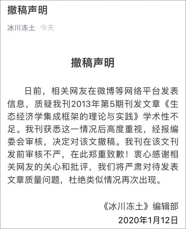 1月12日,《冰川冻土》通过官微回应称,已决定对徐中民的《生态经济学集成框架的理论与实践》进行撤稿。同时,对此前的审核不严致歉。