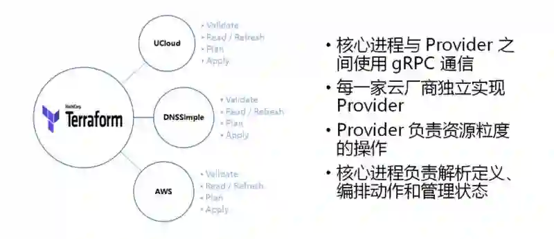 Terraform 使用插件(Plugin = Provider + Provisioner)来抽象出各个云厂商之间的差异,并相互隔离。