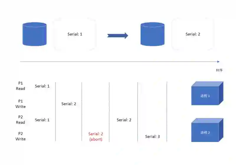 进程 P1 和 P2 依次读到了序号为 1 的数据,并且都想进行写操作,P1 先修改数据,自增序号为 2 并写入成功,此时 P2 进行写操作时,由于修改后的序号同样为 2,此时应抛出写失败,P2 需要主动重新读取最新的数据再次修改,才能成功写入。