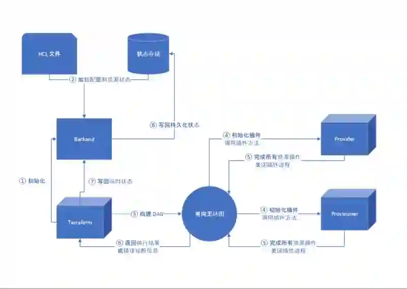 • Terraform 核心进程:负责资源定义文件,构建有向无环图,管理状态存储;
