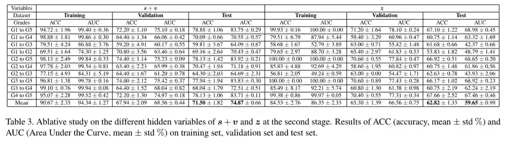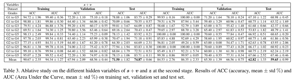 表3. 在一到五年级所有时间序列上使用不同隐变量(s+v vs z)对疾病进行预测,在训练集,验证集及测试集上的ACC与AUC结果对比