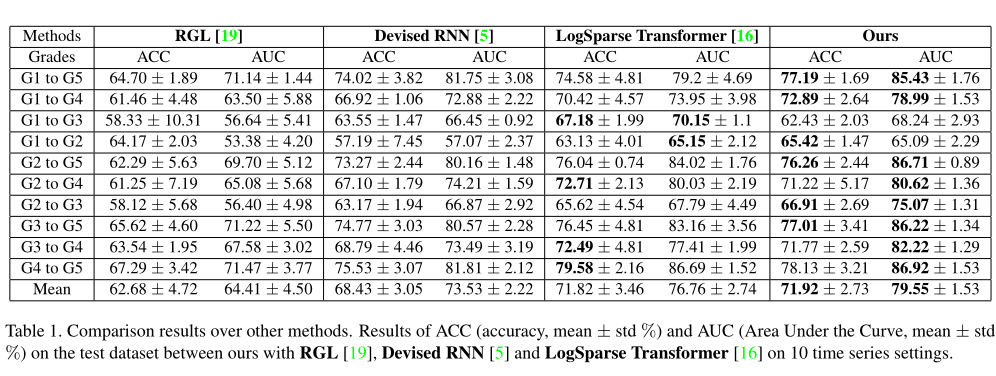 表1. 与对比方法RGL, Devised RNN, LogSparse Transformer在一到五年级所有时间序列上的ACC与AUC结果对比