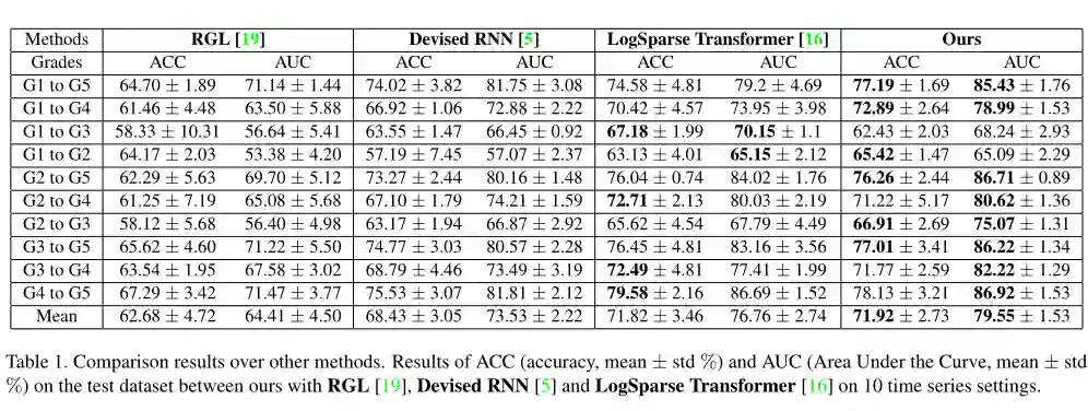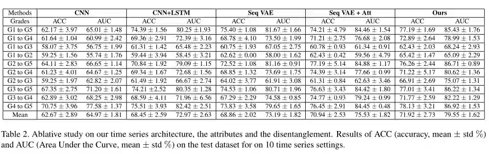本文收集了507个个体样本,每个样本包括一到五年级的视网膜图像数据以及相应年级的属性数据,以及六年级的视盘萎缩疾病标签数据。作者对507个样本进行了数据集的划分,其中训练集验证集测试集的数量分别为300,100,107。为了更好地验证本文方法的泛化性能,作者将训练集验证集和测试集按照性别划分为两个不同的分布,其中前两者数据集的性别分布为男女比2:3而后者测试集性别分布为3:1。作者对包括一到五年级的十个所有可能的时间序列设置下进行了实验,并与多个现有的疾病进展预测和时间序列预测的方法进行了对比。本文的方法在几乎所有的实验设置及平均情况下的 ACC 和 AUC 指标均高于已有方法(如表1所示),展示了该方法在解决时间序列疾病预测问题上的优越性。