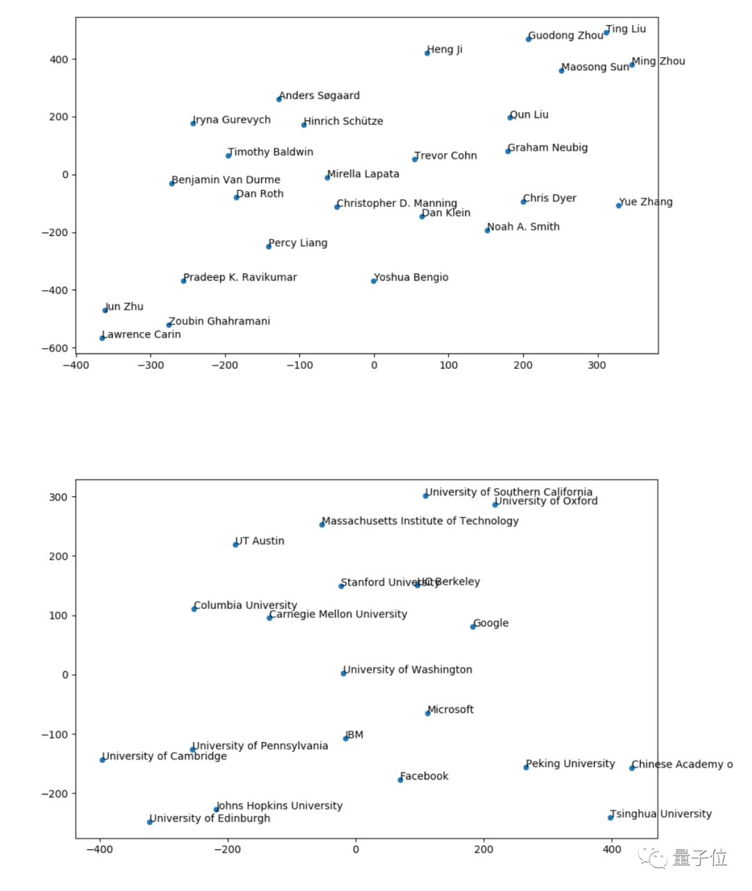 最后,Marek Rei对作者和组织进行了一些主题聚类。他收集了所有与特定作者/组织相关的论文,小写处理和token化之后,用LDA处理,然后利用t-SNE可视化。得到了各个作者和机构研究方向的相似情况。