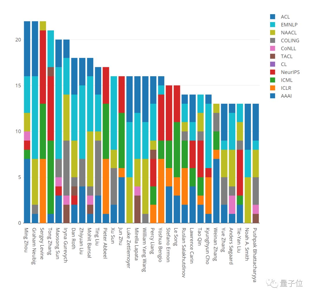 之后便是张潼(最近从腾讯AI Lab离职),21篇;清华大学孙茂松和达姆施塔特工业大学的Iryna Gurevych,每人20篇。