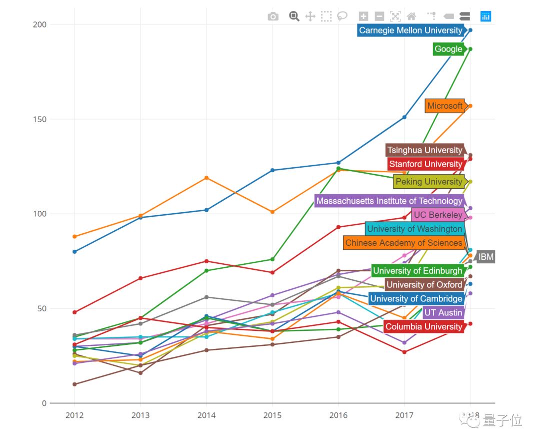 各个机构的比较中,CMU高居榜首,清华北大论文数量快速增长,位居第四和第六。