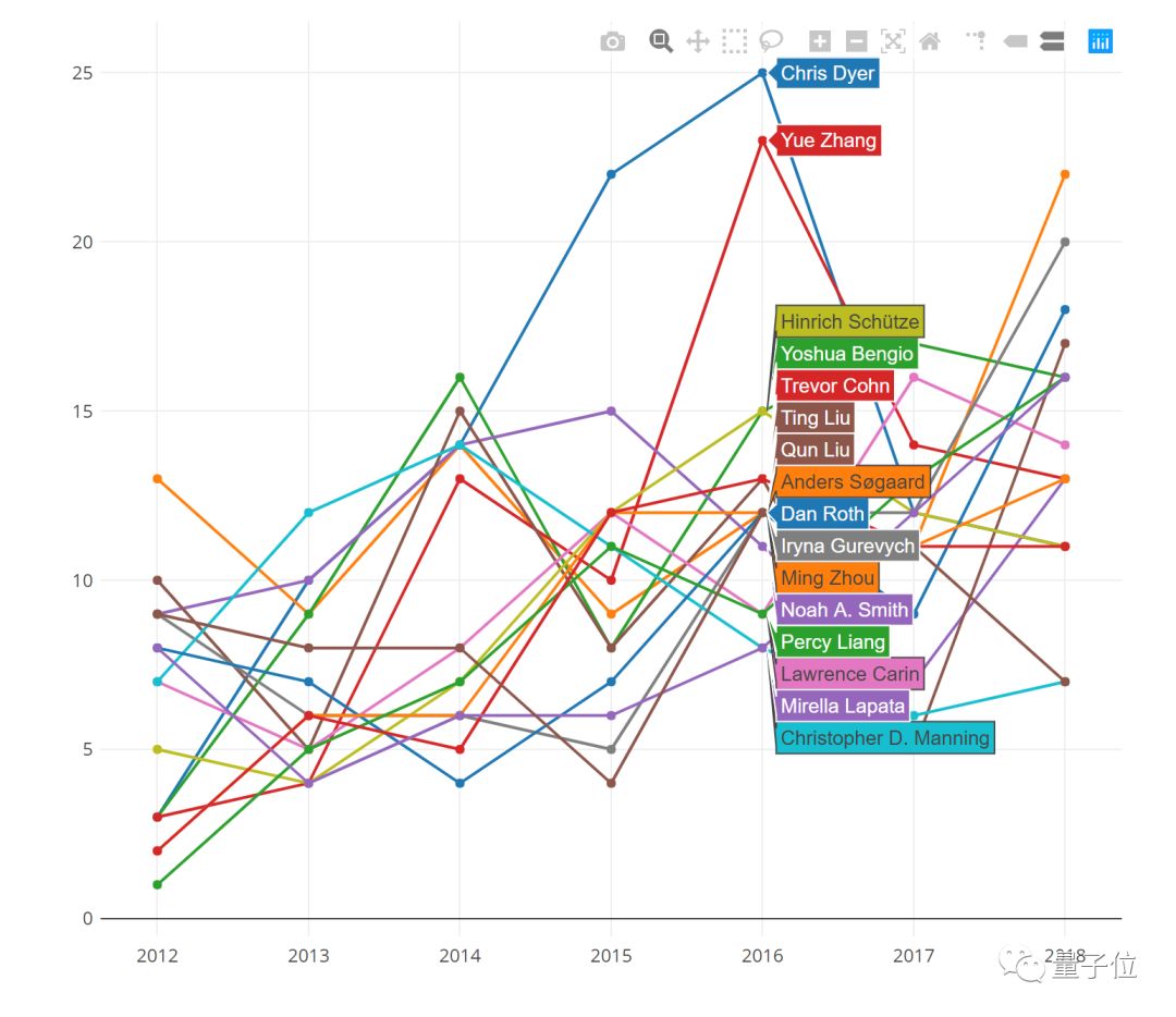 每个作者在不同年份发表论文的情况也都有统计。Chris Dyer在2015和2016年持续霸榜,数量惊人。
