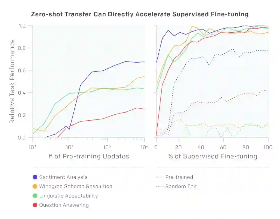 在大量文本上对我们的模型进行预训练,可显著提高其在诸如 Winograd Schema Resolution 等具有挑战性的自然语言处理任务上的表现。