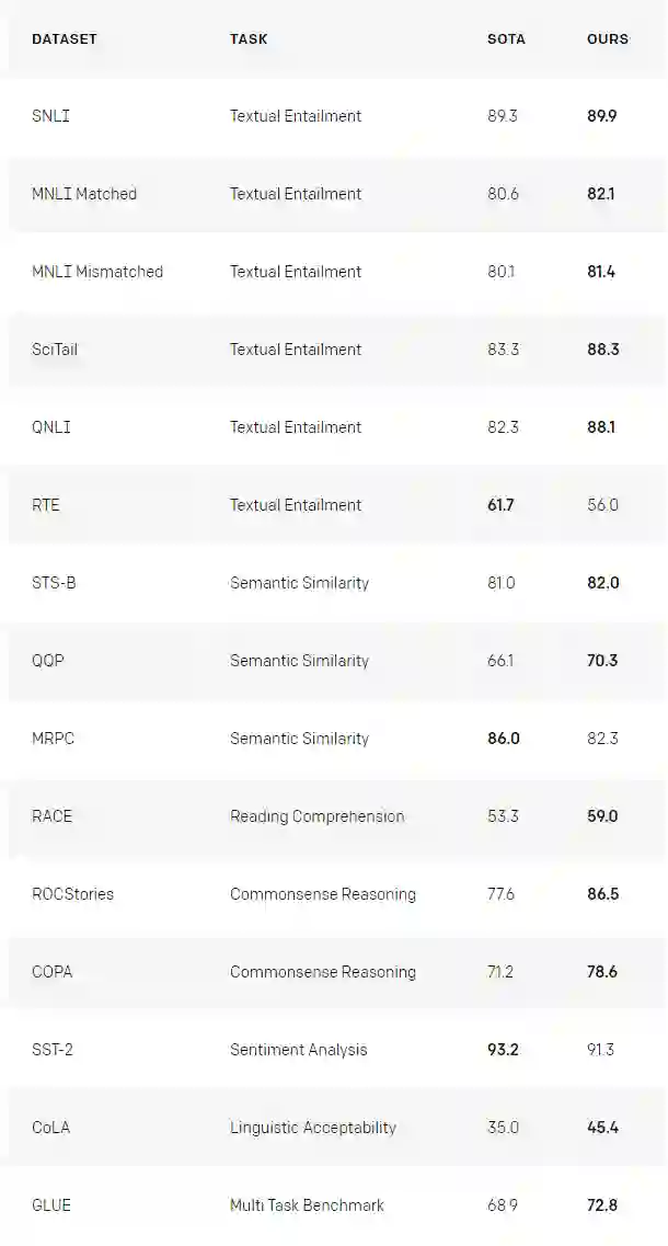值得一提的是该方法在三种关于测试常识推理和阅读理解的数据集(COPA,RACE和ROCStories)上的表现。我们的模型以远超第二名的成绩在这些数据集上获得了最先进的结果。这些数据集普遍被认为需要借助多语句推理和有意义的世界知识进行解决,而我们的模型主要通过无监督学习来提高这些技能。这也表明了通过无监督技术来开发复杂的语言理解功能的可能。这让我们特别兴奋。