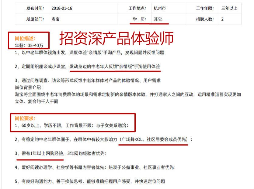如今,淘宝已然成为不少老年朋友生活中不可或缺的一部分。淘宝上共计有3000万老年使用者(年龄50岁以上),和年轻人一样,他们也喜欢购买各种好看的衣服,潮流的3C用品。而淘宝的这轮招聘也是为了让淘宝更懂老年人,让淘宝跟老年用户的关系更加亲密。
