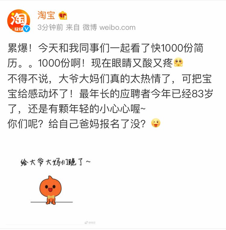 针对这场意外走红的这场招聘,淘宝表示,“目前工作人员正在加班加点筛选简历,并将很快安排候选人参加线下沟通会,也会邀请淘宝产品经理跟老年候选人们进行深度沟通”。