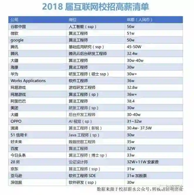 根据校招薪水公号称,2018届互联网校招已经陆陆续续的开展了,通过对高薪岗位梳理发现,有20多家企业年薪突破了30W。