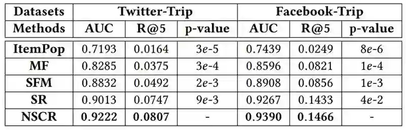 信息域数据集来自 trip.com,同时找到其中一些用户相关的 Facebook 和 Twitter 信息。评估指标为个性化排序的指标 AUC 和 Recall@k。