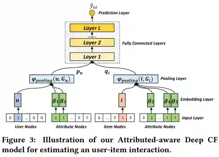 确定目标函数之后,我们来看预测值 ^yui 是通过怎样的模型得到的。本文在 Neural Collaborative Filtering 模型的基础上,进一步加入了 attribute 的信息,结构如下图所示: