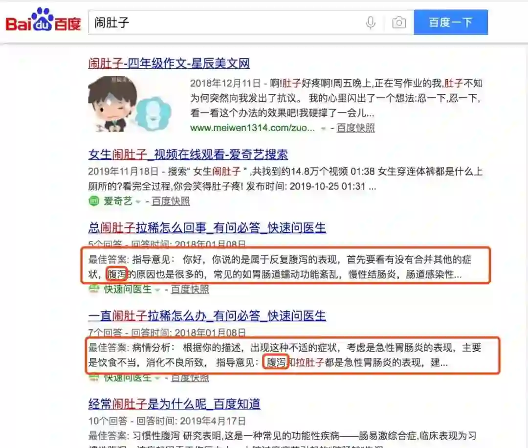 如果目前手头没有类似的场景,而又想构造尽量平行的语料数据的话,一个比较tricky的方案是借助现有的搜索引擎,比如我们用百度搜索“闹肚子”这个关键词: