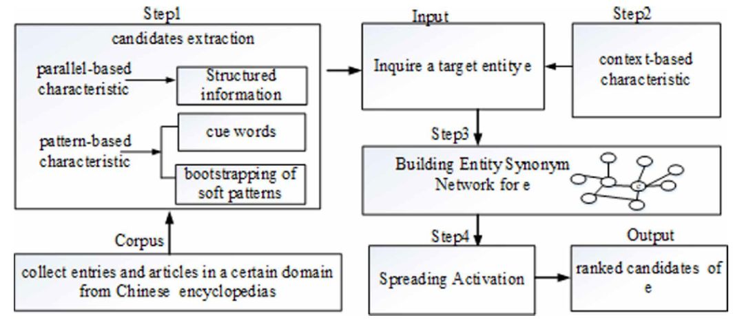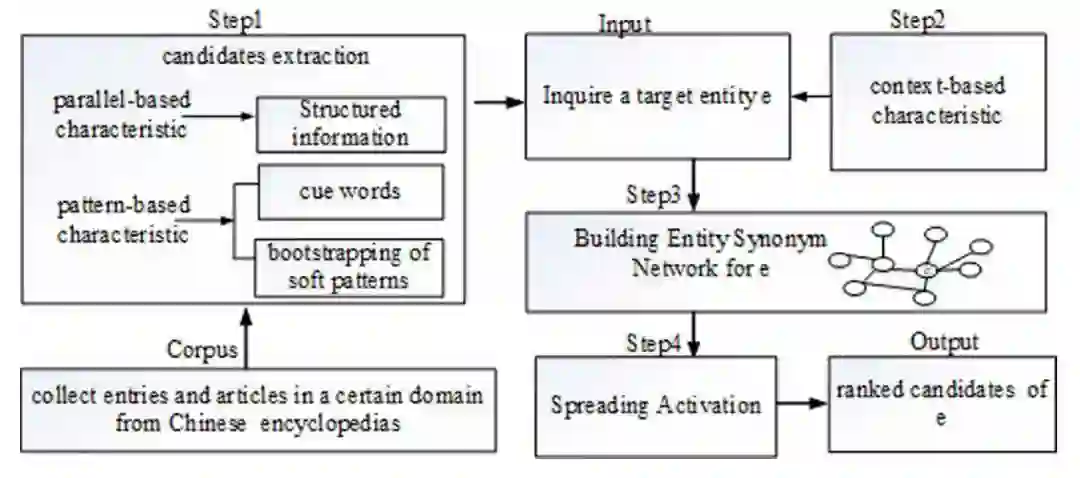 这篇工作的主要内容是从利用百科类数据中的结构化、非结构化文本中获取同义词。整体流程如下: