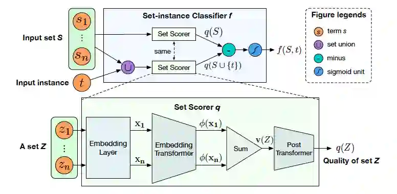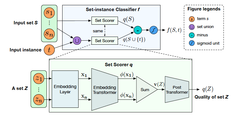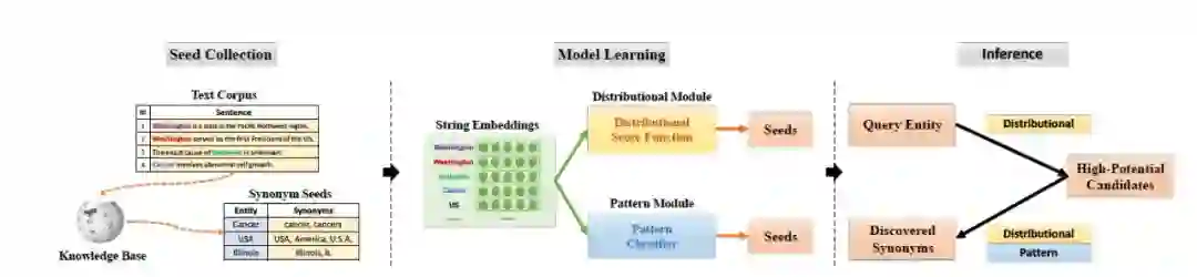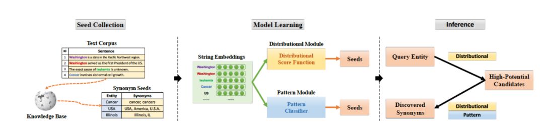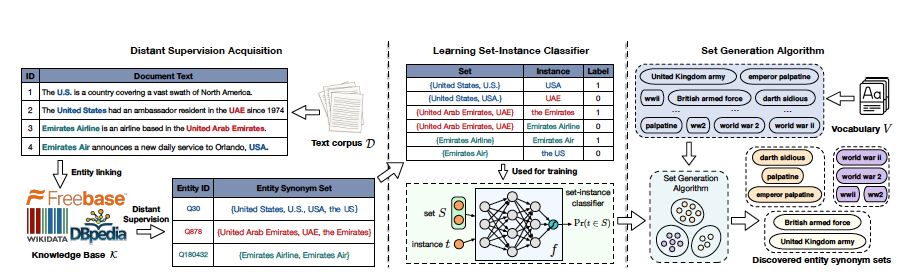 这篇工作进一步增强了对知识图谱中已有同义词数据集的利用。文章中提到了entity synonym set的概念,在整个流程中,作者意在利用库中众多的同义词簇的整体分布,来评估实体词是否属于某一同义词簇。文章的亮点在于集合Set的表示学习,以及新实体进入Set的判定方法。