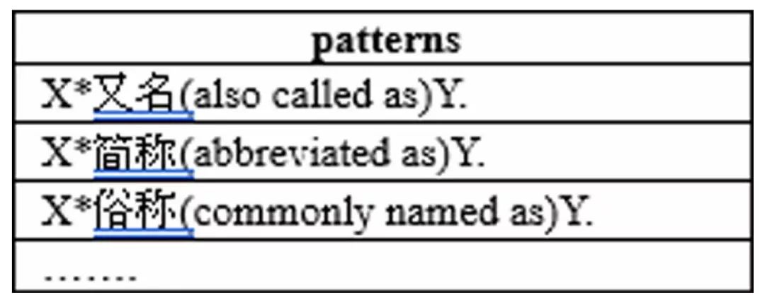 提到从文本数据中抽取数据,一个很朴素的想法就是使用模板,这点我们在之前的文章知识图谱构建综述中也讨论过。其实同义词也算是一种特殊的三元组关系,使用Pattern抽取的方式在正确率上可以保障,但是它的主要问题在于模板的数量以及语义漂移。另外,因为同义词这种关系的特殊性,使用模板抽取的方式对语料数据也有额外的要求,比如我们使用特定的触发词: