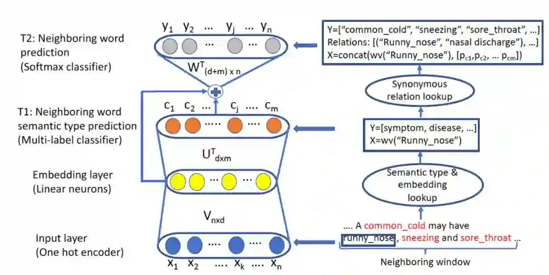 这篇工作的重点在于如何为同义词挖掘这个任务获得更好的预训练词向量。熟悉Skip-gram等词向量训练方法的同学应该都知道,这种方式的本事其实是利用一个有限长度的滑动窗口去获得某个词的表示,这是一个反向映射的过程,而这个过程本身与语义无关。当数据量足够大的时候,我们可能恰巧得到了一个词的同义词,但是更多的时候,我们只能说两个词在语义上比较“相关”,比如“感冒”和“发烧”在医疗领域高频共现,简单的词向量求相似其实难以发现它们的区别。本文就是在Skip-gram的基础上加以改进,以试图加入更多语义相关的信息: