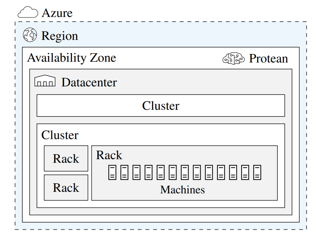 虚拟机作为云计算平台的基本资源分配单元,能够给用户的应用程序提供独立、安全和可靠的运行环境。Protean 需要根据用户的需求自动将 Azure 的各种服务器动态分割成大小不同的虚拟机,并满足用户对于这些虚拟机所处的地理区域(region)和可用区(available zone)的要求,以及虚拟机之间的相对位置、虚拟机对服务器的独占需求等各种限制条件。同等重要的是,Protean 还需要在追求资源的充分利用和预留足够的空闲资源用于容错和扩容之间取得平衡。
