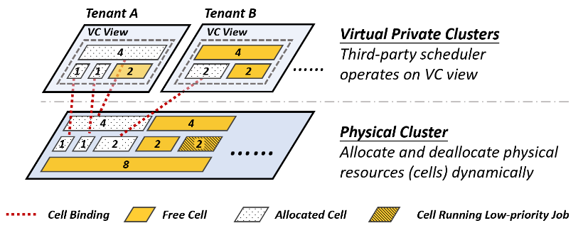 图2:HiveD 为各租户提供独立的 VC,并动态地进行 Cell 和物理 GPU 的绑定