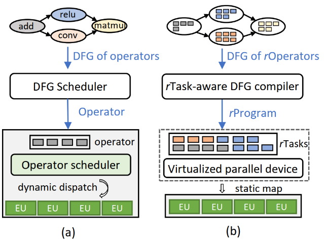 图7:(a)传统深度学习框架,(b)RAMMER 深度学习编译框架